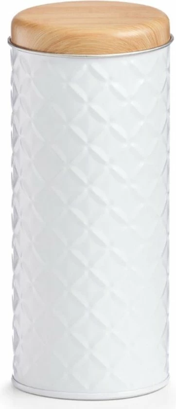 2x Witte bewaar/voorraad blikken voor bijvoorbeeld snoep, koek en koffiepads. De deksel is lucht/geurdicht, waardoor de inhoud vers en vochtvrij blijft. De trommel heeft een houtlook deksel. Afmeting: ca. D18 x H7,5 cm. Inhoud: ca. 2,4 liter, 2400 ml. Materiaal: metaal. Reinigen: Handafwas. U ontvangt 2 stuks. Keukenbenodigdheden – Keukenaccessoires/decoratie – Zeller – Vers houden – Voorraadblikken/bewaarblikken/opslagblikken – Koffiepadstrommel/blik.