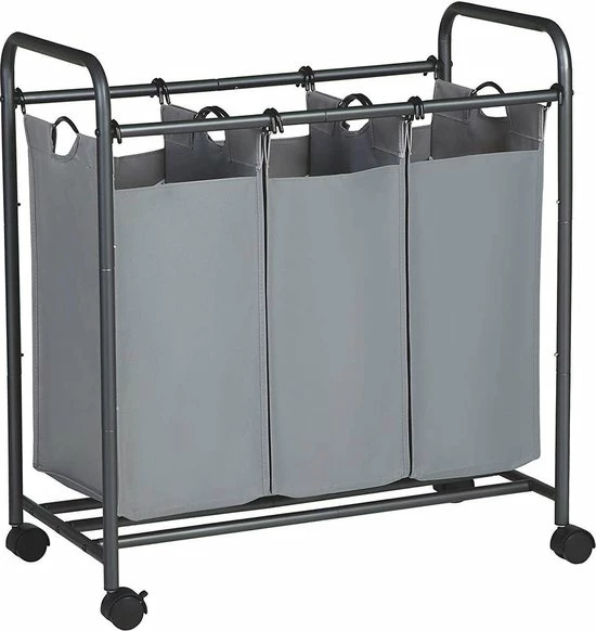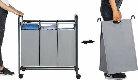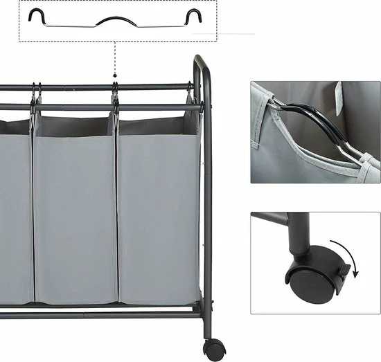 ▶ Extra stevig en kwaliteitsvol: de sorteerder is voorzien van sterke haken die de 3 zakken vasthangen aan de robuuste metalen constructie. Hierdoor vallen de zakken niet van de buizen bij zware was.