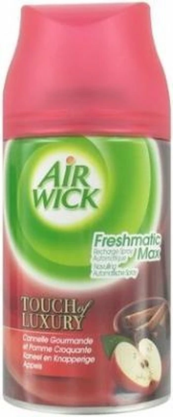 Airwick Freshmatic Max navulling F 250 ml Appel & Kaneel 6 stuksAir Wick Freshmatic Automatische Spray Luchtverfrisser neutraliseert geurtjes en laat je woning fris ruiken. Air Wick Freshmatic is een luchtverfrisser die een heerlijk frisse geur in huis brengt en verspreidt dit tot wel 60 dagen (op de laagste stand). Hang de luchtverfrisser aan de muur of plaats hem op een wandrek of kast en kies zelf uit drie intensiteitsniveaus. Geschikt voor alle vertrekken van het huis. De Lavendel Freshmatic zal je huis verfraaien met de frisse geur van Appel & Kaneel, zonder toegevoegd water en met 24/7 odour stop technology.