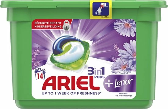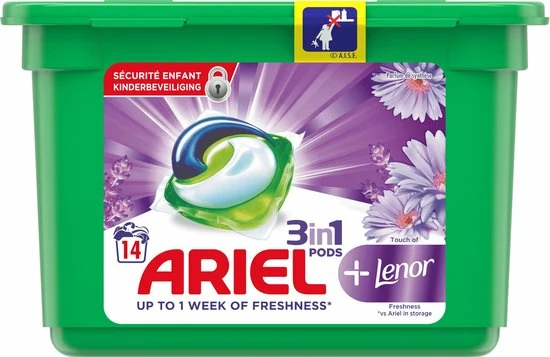 Ariel 3in1 Pods + Touch Of Lenor biedt de uitstekende reiniging van Ariel en een extra frisse bloemengeur van Lenor. Dit komt door de unieke technologieën die niet slechts de geurtjes maskeren, maar ze bij de bron verwijderen, waardoor er een blijvende frisse geur achterblijft. De Ariel 3in1 Pods + Touch of Lenor heeft een uniek ontwerp en is een supergeconcentreerde wasmiddelcapsule die met verschillende compartimenten de ingrediënten stabiel en gescheiden houdt totdat ze de was bereiken. De innovatieve laag van Ariel wasmiddelcapsules lost bij contact met water volledig op en geeft hun krachtige reinigingskracht vrij die een heleboel soorten vlekken en geurtjes bestrijdt met precies de juiste hoeveelheid wasmiddel. Gebruik samen met Unstoppables Active, een geurbooster voor de was, voor een extra boost van frisheid. Let op. Dit product kan schadelijk zijn en ernstige verwondingen veroorzaken. Ariel pods buiten het bereik van kinderen houden.