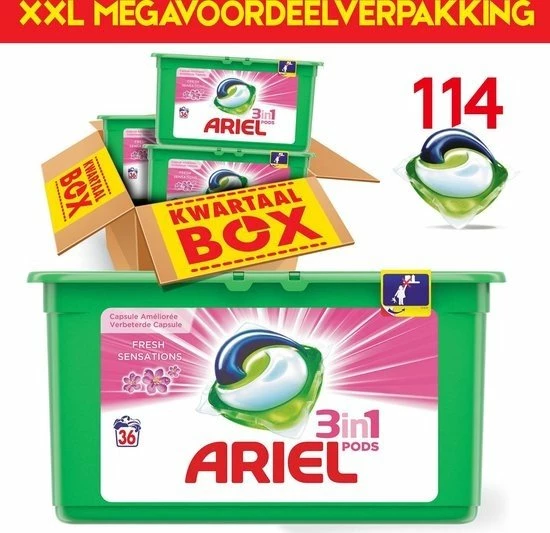 Ariel Wasmiddel Capsules bestaan uit drie krachtige compartimenten in een kleine capsule die samenwerken met als resultaat vlekverwijdering, helder wit en stralende kleuren. Klein maar krachtig, de Ariel Pods geven je was een geweldige wasbeurt.