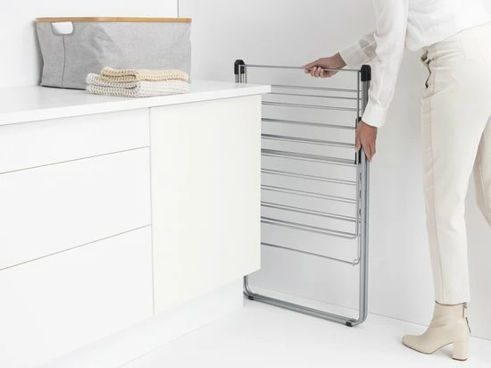 Bespaar energiekosten, vergeet je droger en hang je kleding op een droogrek uit de Brabantia HangOn serie. Stabiel, gemakkelijk in gebruik en verkrijgbaar in verschillende formaten in de kleuren Matt Black, White of Metallic Grey.