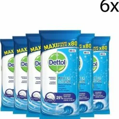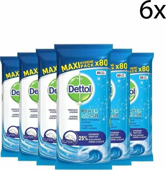De Dettol Schoonmaakdoekjes Power & Fresh zijn 25% efficiënter tegen vuil en zorgen voor een perfecte hygiëne. De schoonmaakdoekjes laten een frisse geur achter en zijn goed te gebruiken tegen keukenvet, zeepresten en badkamervuil. Dit is een grootverpakking en bevat 6x 80 stuks.