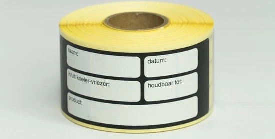 Op het houdbaarheidsetiket kan naast de naam ook de datum, in/uit koeler-vriezer, houdbaar tot en de productomschrijving worden vermeld.