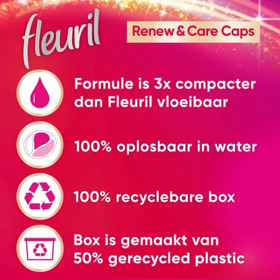 De voorgedoseerde caps zijn 3x compacter dan Fleuril vloeibare wasmiddelen. Daarnaast is de verpakking gemaakt van 50% gerecycled plastic en 100% recyclebaar als de kartonnen hoes verwijderd is. Het folie van de capsule lost ook 100% op in water.