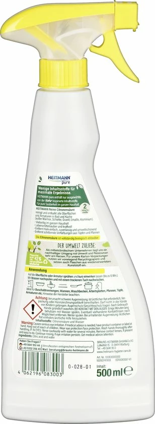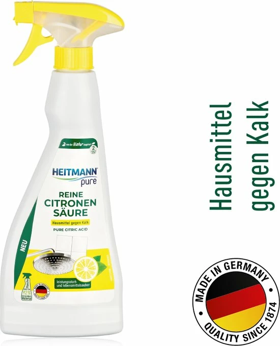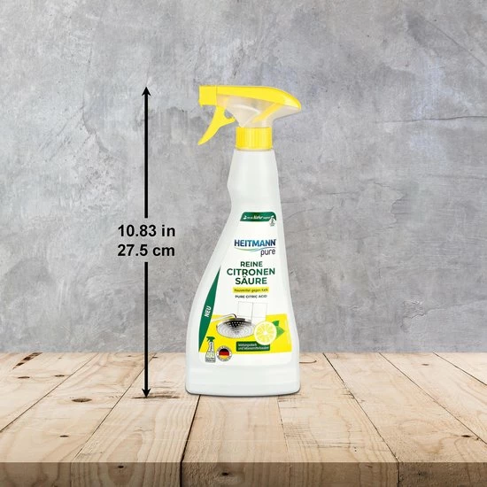 HEITMANN pure Zuiver citroenzuur in een praktische spuitfles verwijdert kalkaanslag op oppervlakken en armaturen in badkamer en keuken. Het kan op verschillende manieren door het hele huis worden gebruikt en is krachtig en schoon.