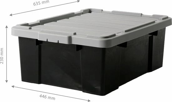 Deze Powerbox opbergbox van Iris Ohyama is gemaakt van extra sterk kunststof en bestaat voor 100% uit gerecycled materiaal. Deze set bestaat uit 3 opbergboxen met elk een inhoud van 43 liter. De box is voorzien van een deksel met kliksluiting. Deze box is perfect voor de doe-het-zelver en voor iedereen die een sterke opbergbox kan gebruiken. De box is nestbaar en makkelijk te stapelen met behulp van de stevige deksel. De Powerbox kan zowel binnen als buiten gebruikt worden voor vele doeleinden, bijvoorbeeld: in de garage voor de opslag van gereedschap. Door de uitsparingen in de deksel kunnen meerdere boxen bijeengehouden worden door middel van een spanband.