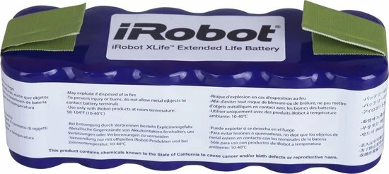 De iRobot® XLife™ Extended Life Battery levert twee keer zoveel reinigingscycli als de voorgaande Roomba-batterijen, zodat de tijdsduur voordat u de Roomba-batterij moet vervangen, verdubbeld wordt. Batterijduur van Roomba blijft hetzelfde tussen het opladen door. Levensduur van de batterij verschilt per huis en gebruik. Gebruik de Roomba zoals aangegeven voor langste levensduur van de batterij. Compatibel met robots van de Roomba 500-, 600-, 700- en 800-serie alsook Scooba 450.
