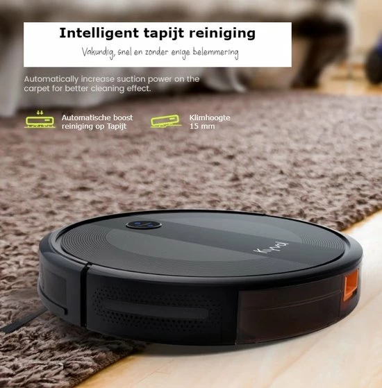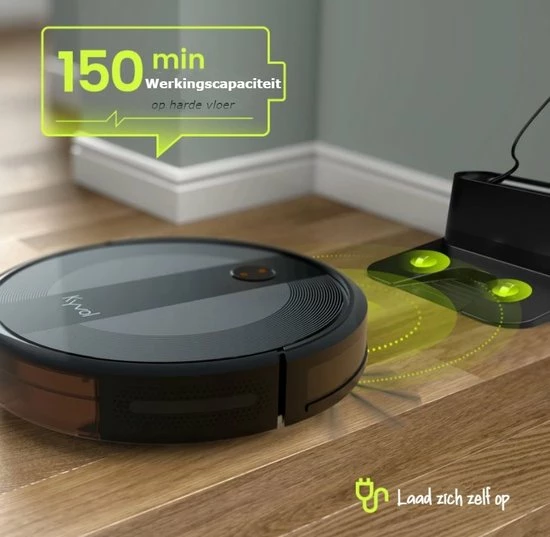 De 3200 mAh lithium-ionbatterij van de robotstofzuiger biedt tot 150 minuten ononderbroken reiniging in de automodus. De robotstofzuiger keert automatisch terug naar opladen wanneer de batterij leeg is of het stofzuigen is voltooid.