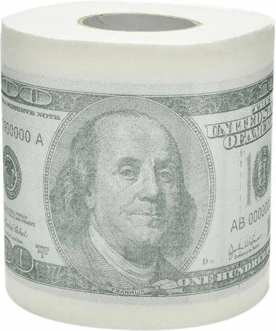 – WC papier / toiletpapier bedrukt met replica’s van 100 dollar biljetten.