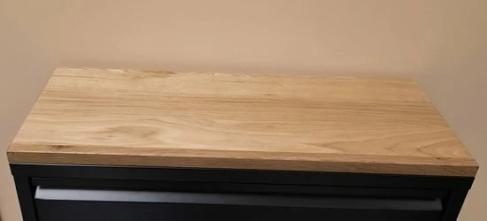 - Boorgaten op de rug van de afvalemmer voor verankering aan de muur. In dit geval raden ophangen boven de grond af gezien het totale gewicht van de prullenbak met de emmers en het eiken paneel.