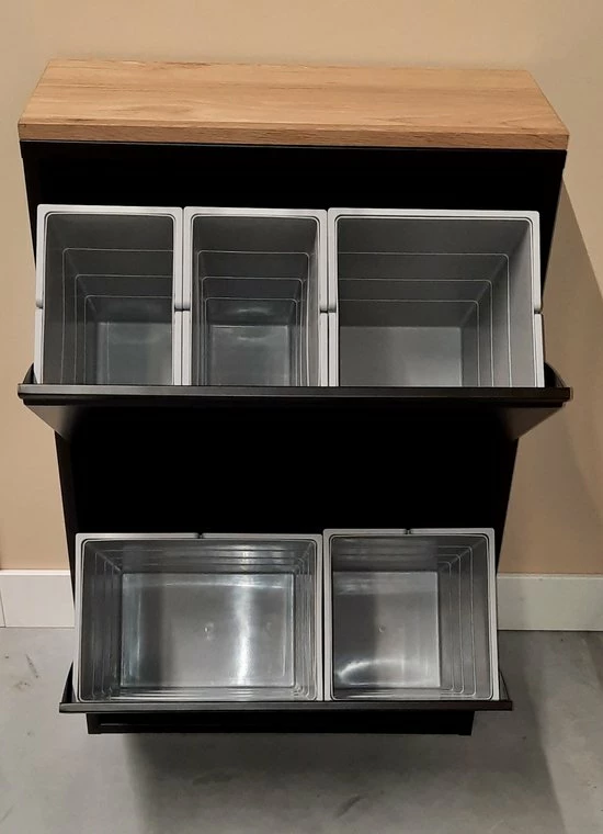 Een afvalbak met 5 binnenemmers om 5 afvalstromen te kunnen scheiden. Kies zelf in welke emmer je wat verzamelt. In het bovenste vak zitten 2 emmers van 10 liter en een emmer van 15 liter. Het onderste vak is gevuld met 1 x 20 liter voor bijvoorbeeld plastic afval en een emmer van 15 liter.