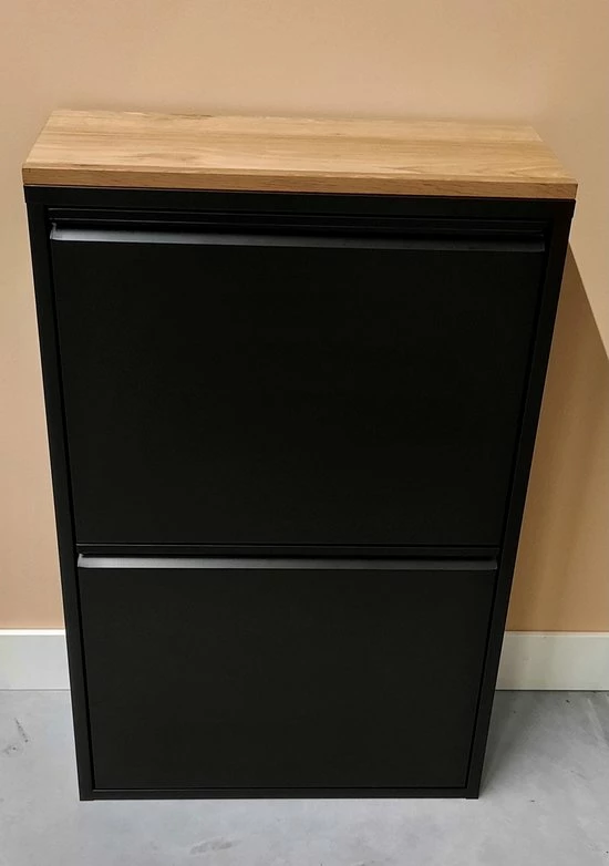 De vuilnisbak is gemaakt van een metalen omkasting met een mat zwarte poedercoating. Op de bovenzijde is afgewerkt met een massief eiken paneel voorzien van invisible lak dus het hout is beschermd. Het eiken paneel geeft de prullenbak een chique uitstraling.
