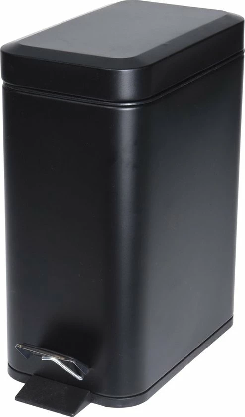 Een zwarte vuilnisbak/vuilnisemmer/pedaalemmer/prullenbak, met een inhoud van 5 liter. De vuilnisbak heeft een kunststof verwijderbare binnen emmer met handvat. Afmeting: ca. 25 x 14 x 29 cm. Materiaal: metaal. Voor meer artikelen uit deze serie zoekt u op de term: blackbathroom. Pedaalemmers/afvalemmers/vuilnisbakken voor de badkamer of in het toilet.