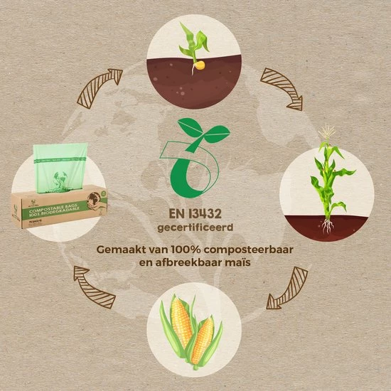 Composteerbaar – De zakjes zijn gemaakt van maïs en eindigen dus niet in de plastic soep. Ze voldoen aan de Europese composteringsnorm EN-13432 en mogen in de GFT bak gedeponeerd worden!