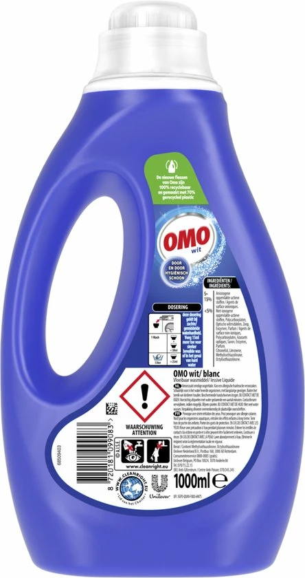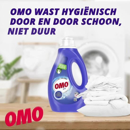Omo Wit Vloeibaar Wasmiddel is geschikt voor de witte was. Omo is al jaren een vertrouwd merk op de Nederlandse wasmiddelen markt en wast al net zo lang hygiënisch door en door schoon. Omo wast ook op korte wasprogramma’s door en door schoon. Het verwijdert allerlei soorten vlekken uit je witte was effectief, zodat je was stralend schoon en fris wordt. Zo was je met Omo dus door en door schoon, ook snel! Met Omo bespaar je tijd en hou je tijd over voor andere dingen. Zo kan je met Omo het huishouden wat efficiënter te maken. Omo Wit Vloeibaar Wasmiddel zit in een fles gemaakt van gerecycled en 70% recyclebaar plastic, voor maar liefst 80 wasbeurten.