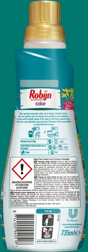Paradise secret is een wasmiddel uit de exclusieve Robijn collection lijn. Deze heerlijke geur zorgt voor een beetje paradijs in elke wasbeurt. Gebruik voor de lekkerste geur ook de bijpassende paradise secret wasverzachter. Paradise Secret is geschikt voor alle bonte- en gekleurde was op 30-40-60 °C. Doseer 35ml wasmiddel voor een standaard was of 52ml wasmiddel voor een grote of sterk bevuilde was. Robijn Klein & Krachtig kunt u voor alle textielsoorten gebruiken, behalve voor wol en zijde. Gebruik hiervoor Robijn Wol en Fijn. Buiten het bereik van kinderen bewaren. Ieder kledingstuk heeft zijn eigen behoefte, op basis van de stof. Daarom is het handig om eerst de wasvoorschriften te lezen op het etiket binnen in kleding. Een goede was begint bij het sorteren. Het is handig nieuwe kleding de eerste keren apart te wassen, in verband met het doorlopen van kleuren. Je kunt hiermee doorgaan, totdat de kleding geen kleur meer afgeeft aan het water. Je zult zien dat je kleding langer mooi blijft! Daarna is het belangrijk dat je bij elkaar behorende kleurige kleding samen wast. Zo kun je langer genieten van die stralende kleuren. Gebruik het juiste wasmiddel voor verschillende soorten was: Robijn Color voor je gekleurde was, Robijn Stralend Wit voor al je witte was en Black Velvet voor de donkere en zwarte was. Fijne was wordt goed verzorgd met Robijn Fleur & Fijn wasmiddel, dat de kwetsbare vezels beter beschermt. En voor wolwas is een product nodig met een neutrale pH-waarde en zonder enzymen, zoals de Robijn Wol & Fijn. Gebruik ook het juiste wasprogramma voor de verschillende materialen. En was altijd op de laagst aanbevolen temperatuur. Voor al je kleding geldt dat het langer mooi blijft als je het binnenstebuiten wast. Dan worden je vezels beter beschermd en blijven ze langer intact. Het motto van Robijn is al jaren “Wat mooi is, moet mooi blijven”. Met het wasmiddel en wasverzachter van Robijn zorg je dat je kleding langer als nieuw blijft, en bovendien heerlijk ruikt. Let op: voor het meest frisse resultaat stop je de machine niet te vol. Gebruiksaanwijzing: • Voor alle bonte en gekleurde was op 30-40-60℃ • Lees het wasetiket in de kleding. • Licht- en donkergekleurd wasgoed niet samen wassen. • Nieuwe gekleurde kleding eerst apart wassen, of controleren op kleurafgifte. • Giet de aanbevolen dosering in de waslade of in de doseerbal en doe deze in de trommel. • Robijn kunt u gebruiken voor alle textielsoorten gebruiken, behalve voor wol en zijde. Gebruik hiervoor Robijn Wol & Fijn. Wastips: • Sorteer je kleding op kleur en materiaal. • Het beste kunnen bij elkaar horende kleurige artikelen bij elkaar gewassen worden om kleurverschil te voorkomen. • Voorkom dat (licht) gekleurde was samen met witte was gewassen wordt. • Voor al je kleding geldt dat het langer mooi blijft als je het binnenstebuiten wast. Dan worden je vezels beter beschermd en blijven ze langer intact. • Gebruik het juiste wasmiddel voor verschillende soorten was: Robijn Color voor je gekleurde was, Robijn Stralend Wit voor al je witte was en Black Velvet voor de donkere en zwarte was. Fijne was wordt goed verzorgd met Robijn Fleur & Fijn wasmiddel, dat de kwetsbare vezels beter beschermt. En voor wolwas is een product nodig met een neutrale pH-waarde en zonder enzymen, zoals de Robijn Wol & Fijn. • Stop je wastrommel niet te vol voor een schone en frisse was • Een dopje wasverzachter zorgt voor een beschermend laagje over de vezels van je kleding, waardoor de kleuren langer mooi blijven en de stof minder snel slijt.