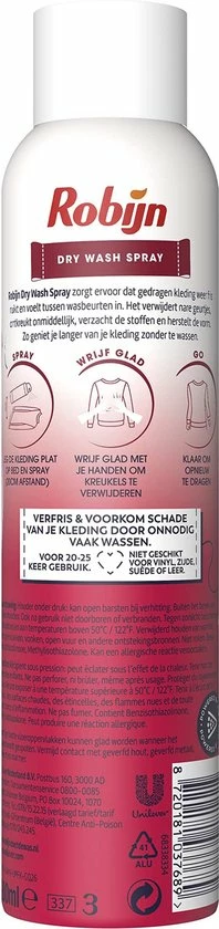 We kennen het allemaal: in je kledingkast op zoek naar je favoriete blouse of jurk, maar deze ligt op de stoel in je slaapkamer. Al een keer gedragen en niet helemaal fris meer, maar ook niet vies genoeg om te wassen. Zou je hem nog een dag kunnen dragen? Met Robijn Pink Sensation Dry Wash Spray verfris je kleding tussen wasbeurten in. De spray verwijdert nare geurtjes, ontkreukt onmiddellijk, verzacht de stof en herstelt de vorm. Je kleren hebben een frisse geur en voelen alsof ze net uit de wasmachine komen. Je kunt langer van je kleding genieten zonder te wassen. Bijna de helft van de kleding die we wassen is niet vuil. Daarnaast is te vaak wassen schadelijk voor je kleding en is het zonde van de tijd en water. Gebruik: 1. Spray: leg de kleding plat op bed en spray (20 cm afstand). 2. Wrijf glad: wrijf glad met je handen om kreukels te verwijderen. 3. Hang 5-10 minuten op en laat even opdrogen. En klaar om opnieuw te dragen. Let op: sommige harde vloeroppervlakken kunnen glad worden wanneer het product gespoten wordt. Advies is om product boven een zacht oppervlak te gebruiken, bijvoorbeeld op bed. Laten we proberen meer te genieten in een wereld die maar doorraast en soms aan je voorbij vliegt. Juist van kleine dingen, zoals alle geuren en kleuren die je in het dagelijks leven tegenkomt. Met Robijn kan je in geuren en kleuren van dit soort momenten genieten.