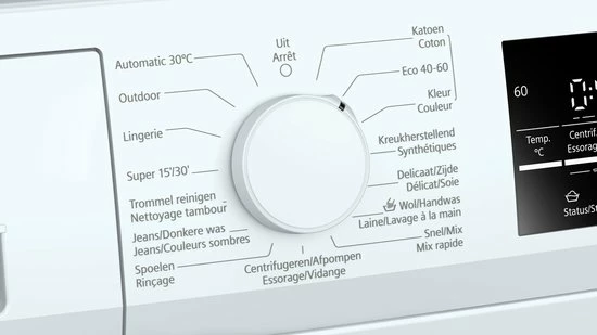 - Speciale programma’s: Automatic fijn, Trommel reinigen met automatische herinnering, Lingerie, Jeans/Donkere kleuren, Outdoor, Afpompen/Centrifugeren, Mix/Snel, Spoelen, SuperKort 30/15