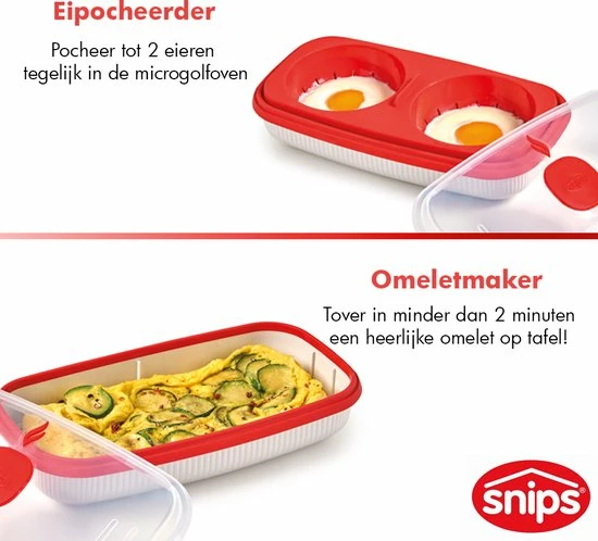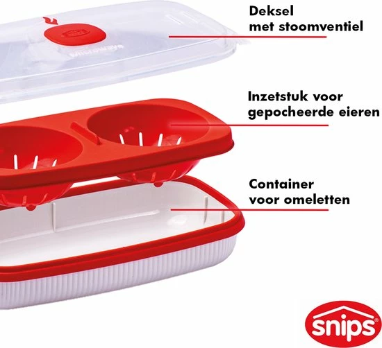 De driedelige eipocheerder is zeer handig in gebruik: voor een omelette is de onderste container nuttig. Klop de eieren los, voeg ingredienten toe en kook 2 minuten in de magnetron voor een heerlijke, luchtige omelette! Het rode bakje, met zijn twee halfronde holtes, is natuurlijk bestemd voor het bereiden van de fijnste gepocheerde eieren. Prik in elk ei eenmaal met een vork. Giet vervolgens 1 soeplepel water op elk ei, zodat het ei precies op de juiste manier gaart. Zorg ervoor dat je de container daarna goed sluit! In de magnetron voor 1 minuut, afhankelijk van het vermogen watt. De container is zowel bestand tegen kou als tegen hitte en kan daarom na gebruik in de vaatwasser worden gereinigd.
