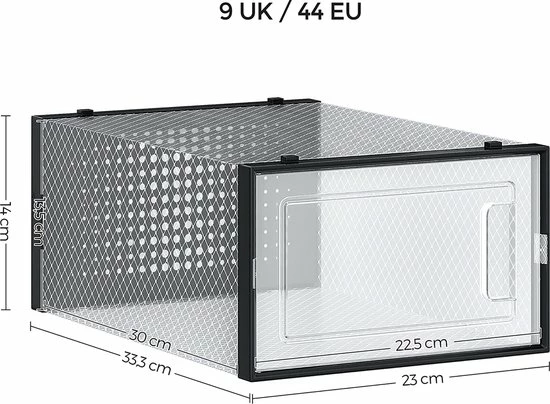 - OVER EEN OF ANDERE: Heeft u een groot opslagsysteem nodig? De uitsnijding van de bovenkant maakt het mogelijk om meerdere dozen stabiel op elkaar te stapelen; of wilt u de schoenendozen naast elkaar zetten? Ook geen probleem! Het maakt niet uit hoe u de dozen plaatst, de praktische luchtgaten zorgen er altijd voor dat uw schoenen kunnen ademen.
