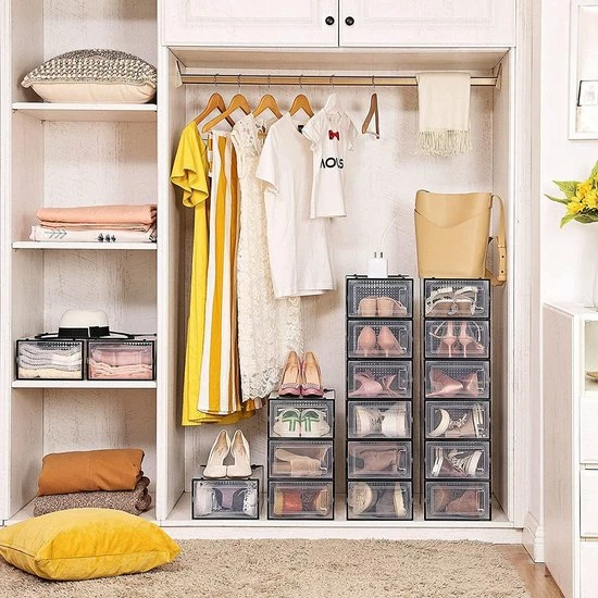 - CHAOS, WEGWEZEN! Zakt je huis regelmatig weg in een schoen-chaos? Dan komen deze 18 schoendozen, die een transparant lichaam en een transparante deur hebben, goed van pas. Breng orde in uw schoenencollectie!