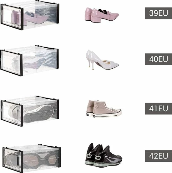- WAT U KRIJGT: 18 opvouwbare transparante schoenendozen, die voorzien zijn van een deur en ventilatieopeningen en die op elkaar gestapeld kunnen worden om ruimte te besparen. Met deze praktische schoenendozen kun je eindelijk afscheid nemen van de schoenchaos…