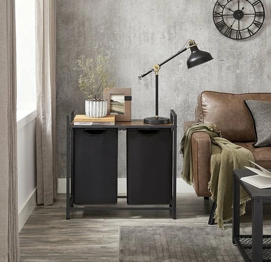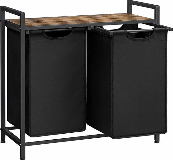 VASAGLE Wasmand, Wasverzamelaar, 2 Vakken, Met Plank, Wassorteerbak, Metalen Frame, 2 Uitneembare Vakken Van Oxford Stof, Met Klittenbandsluiting, Vintage Bruin-zwart BLH201B01