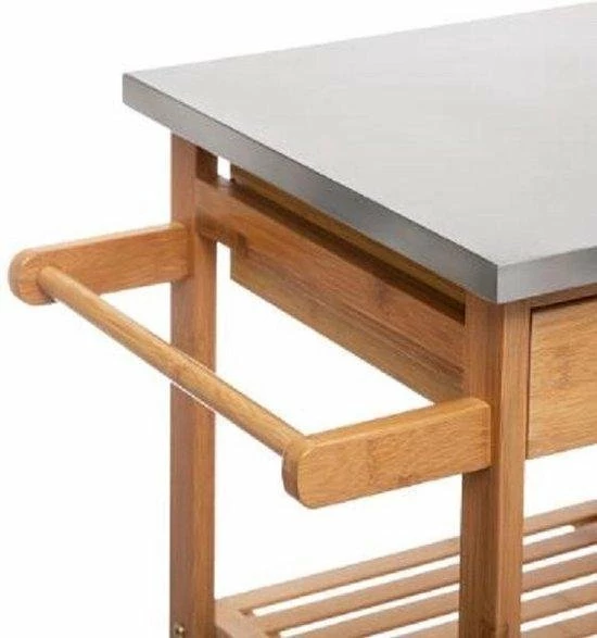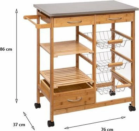 Deze prachtige keukentrolley is een ideaal meubelstuk voor in jouw keuken, terras of in de tuin. Voor de zwoele zomeravonden. Voor ons te laten wegdromen van heerlijke cocktails en witte stranden. Deze keukentrolley is gemaakt van bamboehout en is uitgerust met een metalen werkblad. Onder het werkblad bevinden zicht drie lades met handgreep, twee legplanken voor keukenspullen , drie draadmanden, dat kan dienen om jouw fruit/groenten in te leggen en een handdoekhouder. Dankzij de 4 wielen is de trolleybar een buitengewoon handig, praktisch en gemakkelijk te verplaatsen meubelstuk. Met zijn kleine afmetingen is hij in staat om veel artikelen op te bergen en te ordenen. Dit keukenkastje is ideaal voor kleine keukenopstellingen, omdat de bovenkant als werkblad kan dienen, en het verschillende opbergruimtes heeft om jouw keuken te herorganiseren. De keukentrolley is de beste oplossing voor extra opbergruimte. De trolley heeft een eenvoudig design en trendy look. De levering is gedemonteerd, maar is snel en eenvoudig in elkaar te zetten. Voor eenvoudige montage zijn montage-instructies bij de levering inbegrepen.